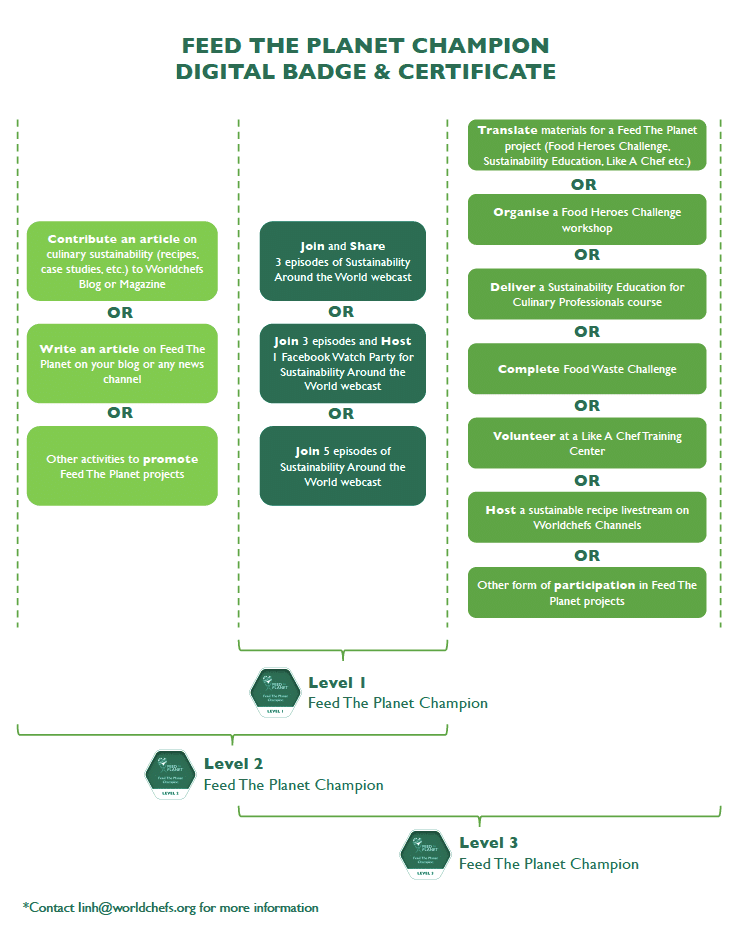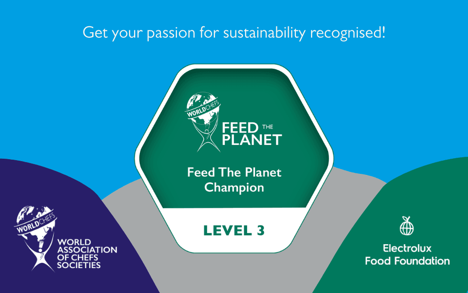 Have you been teaching kids about sustainable food habits? Have you been tracking and reducing waste in your kitchen? Are you an avid follower of Worldchefs’ monthly Sustainability Around the World webcast? If so, your ongoing efforts to promote and practice culinary sustainability will now be rewarded in the form of a digital badgeand certificate issued by Worldchefs Feed The Planet.