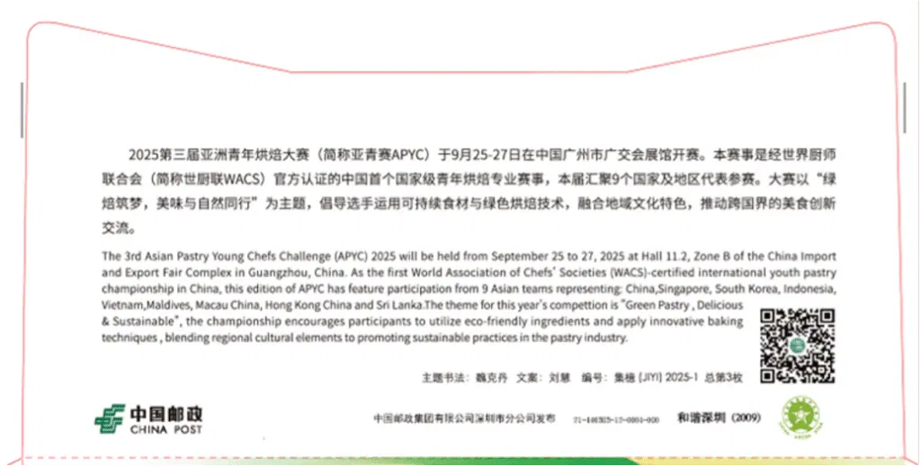 Additionally, the Asian Pastry Young Chefs Challenge received approval from China Post, which launched a First Day Cover with Stamp on September 25-27, 2025, commemorating this milestone event.
