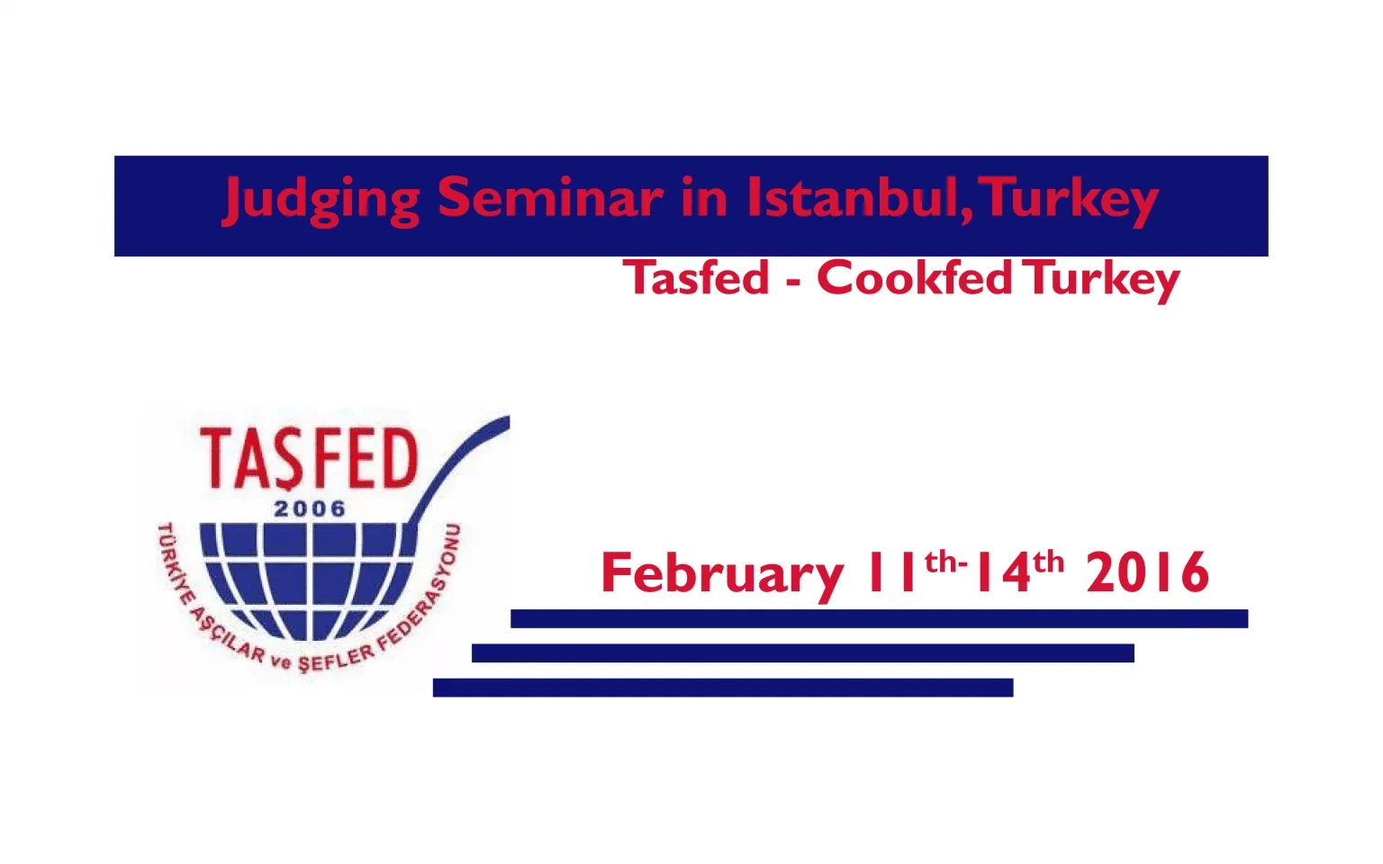 The Tasfed Cookfed Turkey is organising a judging seminar from the 11th to 14th of February 2016 in Istanbul, Turkey. In order to participate please contact Yasar Yalcin MANAV by email.