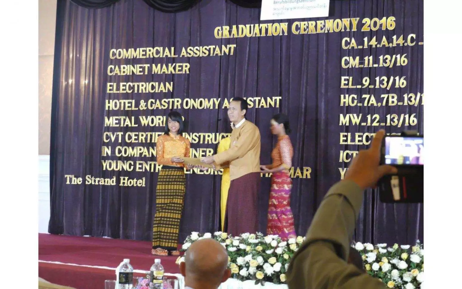One of the very first attendance of the new Yangon State Prime Minister, U Pyo Min Thein, handed over the first certificates of CVT graduates. At the historical Strand Hotel over 500 people in attendance from Industries, students, lectures and parents.