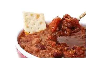Saltine crackers were a likely match, as they were popularized in the early 1800s. They had a long shelf life and were easy to produce. The Chili Appreciation Society International’s Unofficial History of Texas Chili, documenting Lyman T. Davis serving his version of chili with crackers in Corsicana in the 1920s. C. E. Doolin’s Fritos corn chips would come onto the scene in 1932, and Ignacio “Nacho” Anaya’s fried tortilla chips began to catch on in 1943 (when he served them covered in cheese and jalapenos).