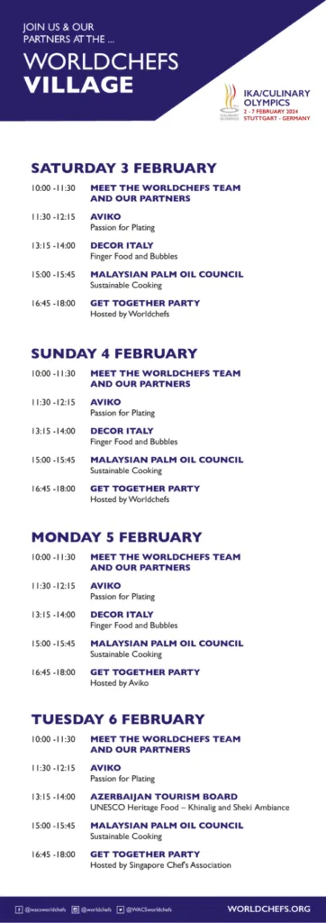 Make the most of your Worldchefs Village experience by checking out our agenda below and don’t forget to check out our social media for live updates and stories.